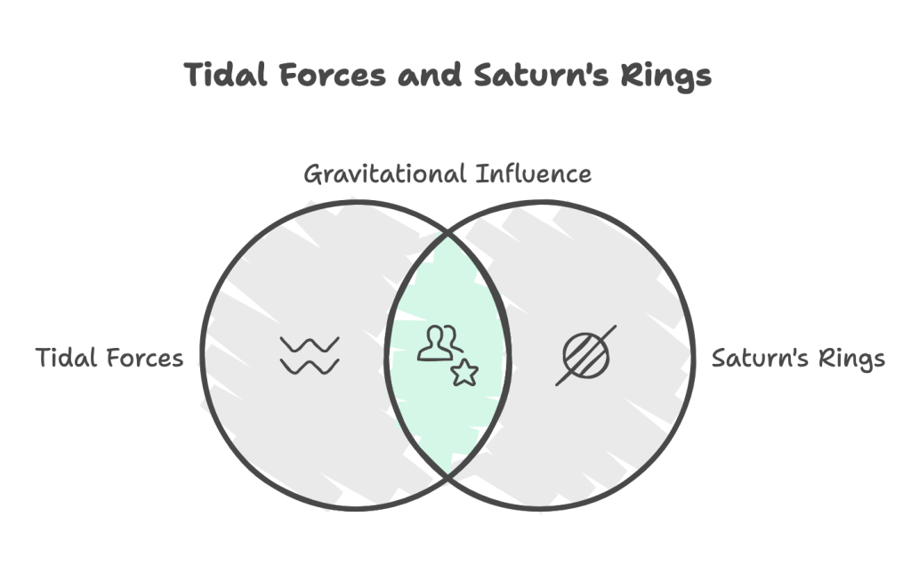 - The rings around Saturn are influenced by tidal forces as well. The planet’s strong gravity keeps particles within certain distances while preventing others from forming larger moons through disruptive tidal effects.